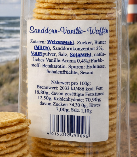 Zutaten: Weizenmehl, Zucker, Butter (Milch) 21%, Maltodextrin, Volleipulver, Salz, Sojamehl Emulgator: Sojalecithin, natürliches Vanillearoma Farbstoff: Betracarotin, Spuren: Erdnüsse, Schalenfrüchte, Senf, Sesam