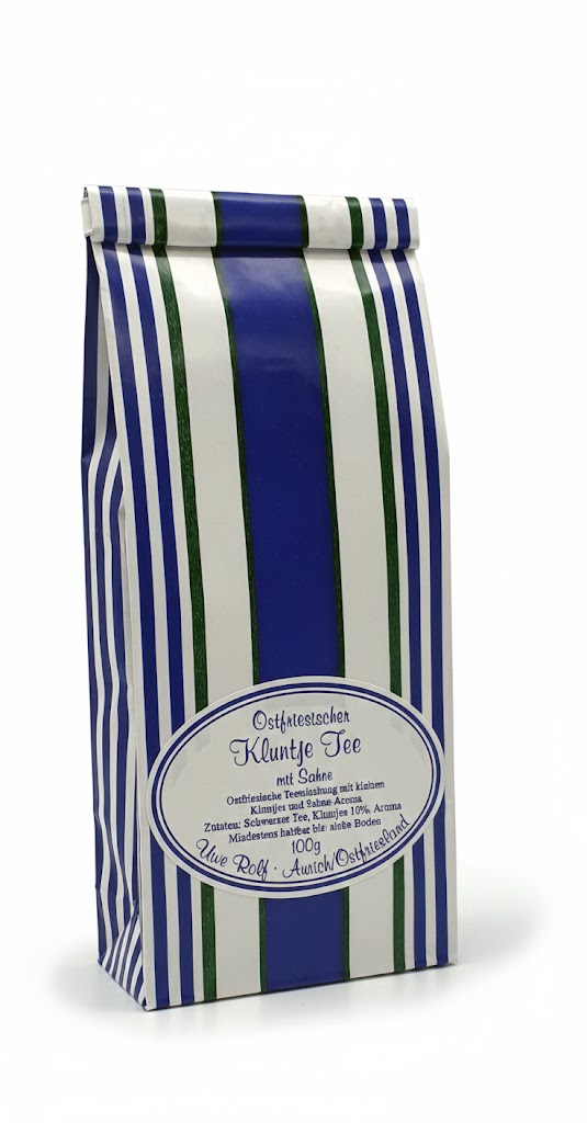 Genießen Sie den Klassiker der ostfriesischen Teekultur fix und fertig gemischt. Unser Kluntje Tee mit Sahne vereint kräftigen Schwarztee mit dem sanften Aroma frischer Sahne und der traditionellen Süße echter Kluntjes.